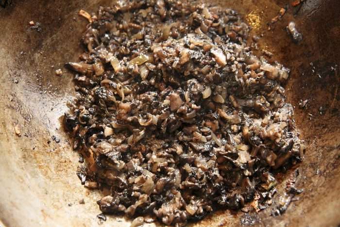 Cozinhe os cogumelos: Adicione os cogumelos picados no refogado de cebola e cozinhe em fogo baixo até que o todo líquido evapore. Os cogumelos soltam muita água no processo de cozimento.
