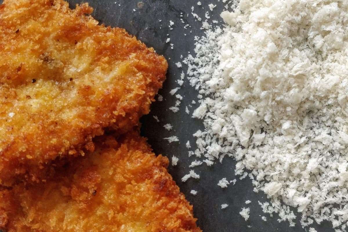 - Asse o panko: distribua as migalhas em uma forma grande e asse por 10 minutos, ou até o pão secar. O pão não deve dourar, deve ficar bastante branco.