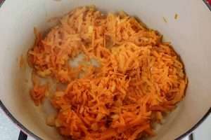 Adicione a cenoura ralada: quando a cebola ficar macia, adicione a cenoura ralada e refogue, em fogo baixo, até que a cenoura fique levemente macia.