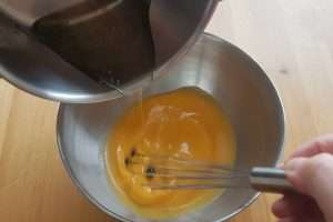 Incorporação da calda de açúcar: Quando a calda de açúcar atingir temperatura de 50°C ou que seja possível tocá-la sem se queimar, adicione-a pouco a pouco à mistura de gemas e leite de coco.