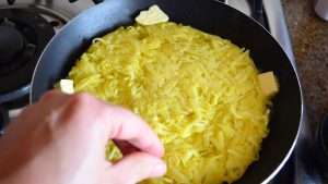 Adicione manteiga: depois de 3 minutos fritando, coloque pedacinhos da manteiga nos cantos da frigideira e mexa a frigideira para que eles penetrem por baixo da batata. A manteiga fresca ajudará a dourar a batata rosti e lhe dará mais sabor.
