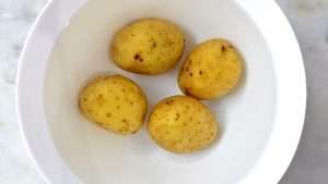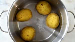 Pré-cozinhe as batatas: Em uma panela média, coloque as batatas e cubra-as com água em temperatura ambiente e adicione uma colher de chá de sal à água. Em seguida, leve para cozinhar, inicialmente em fogo alto. Quando a água ferver, abaixe o fogo e deixe cozinhar por 10 minutos.