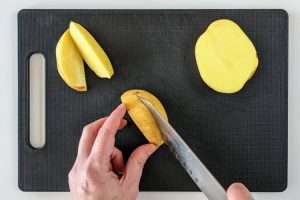 Cortar: corte as batatas em formato de cunha; recomendamos cortar em 8 pedaços