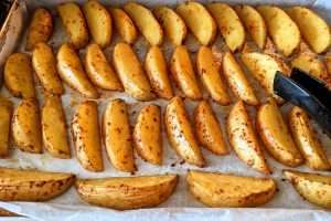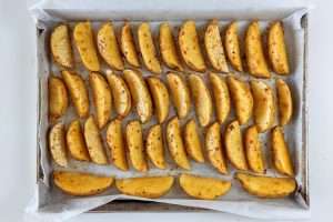 Receita de batata assada com casca, cortada em formato de cunha. Temperada com alho e cebola em pó, páprica, sal e pimenta.