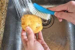 Lavar batatas: lave bem as batatas e use uma escova para retirar resíduos de terra. Seque-as bem.