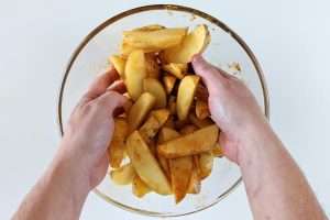 Misturar batatas e temperos: misture bem as batatas e o tempero.