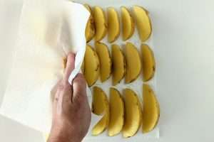 Secar: seque as fatias de batata, uma a uma. Isso é importante para que elas fiquem mais crocantes depois de assadas; use papel absorvente para secá-las