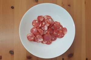Prepare os ingredientes (mise en place): Separe todos os ingredientes e meça-os, deixando-os devidamente prontos para o início da receita.Esta etapa é importante para o sucesso da sua receita, pois evita surpresas desagradáveis no meio do processo. Fatie o chouriço: Com uma faca afiada, retire a pele do chouriço ou linguiça portuguesa. Em seguida, corte-o em fatias bem finas, entre 2 a 3 mm de espessura. Reserve.
