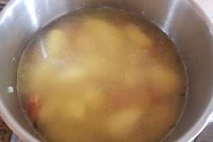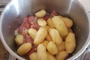 Adicione as batatas: Quando as fatias de chouriço estiverem levemente fritas, adicione a batata.
