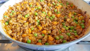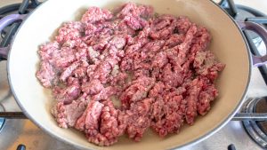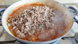 Adicione a carne moída: após a adição dos molhos e condimentos, retorne a carne moída dourada à frigideira, misture bem e mantenha em fogo baixo até que o molho reduza – não deixe o molho ressecar totalmente. Queremos que a carne tenha um molho cremoso ao redor dela.