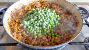 Adicione as ervilhas congeladas: Quando o molho reduzir, adicione as ervilhas congeladas, mexa bem e cozinhe por mais 2 minutos ou até que as ervilhas descongelem. Desligue o fogo e caso não tenha utilizado uma frigideira que possa ir ao forno, transfira a mistura de carne moída para um recipiente refratário.