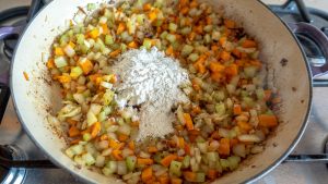 Adicione a farinha de trigo: Quando a cebola estiver translúcida e um pouco dourada, adicione a farinha de trigo e mexa até que a farinha tenha se incorporado na mistura.