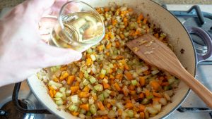 Adicione o vinho: Quando a incoporação da farinha, adicione o vinho tinto ou branco seco e raspe o fundo da panela. Se necessário, adicione um pouco de água para ajudar a desgrudar completamente os resíduos do fundo da panela.