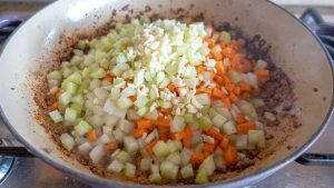 Doure a carne moída: frite a carne até que esteja cozida (não mais vermelha) e com algumas pedaços dourados. Retire a carne moída da frigideira após 10 minutos de cozimento.Não limpe a frigideira, pois este fundo com resíduos é importante para dar sabor ao prato final. Utilize a mesma frigideira para o resto da receita. Refogue a base aromática: após retirar a carne moída da frigideira, reduza o fogo para fogo baixo e adicione o restante do azeite de oliva, a cebola, o alho, aipo/salsão e cenoura. Deixe refogar por 3 a 4 minutos, até que a cebola esteja translúcida e comece a dourar.