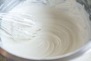 Adicione os demais ingredientes: Adicione o açúcar e a baunilha. Quando o creme começa a ganhar textura de chantilly, o rastro do fouet aparece na superfície da preparação.