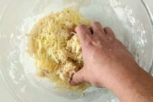 Adicione o queijo e misture bem, como se fosse sovar a massa, até obter uma massa bem homogênea. A massa deve desgrudar facilmente das mãos - coloque mais polvilho caso a massa esteja grudenta