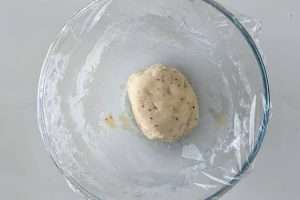 Deixe a massa descansar por cerca de 30 minutos, coberta com filme plástico, toalha, tampa ou prato.