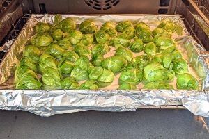 Colocar na forma: retira a forma quente do forno e adicione os pedaços de couve-de-bruxelas. Coloque a parte cortada para baixo, para que fique em contato com o calor da forma e fique bem dourada