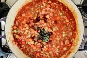 Adicione os molhos e condimentos: quando o vinho tiver quase totalmente evaporado, adicione a polpa de tomate, o molho inglês/molho Worcestershire e os temperos (alecrim, tomilho, sal e pimenta). Misture bem.