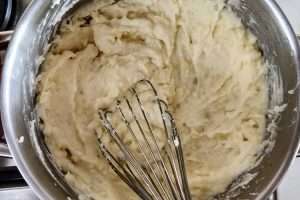 Adicione a manteiga e o leite: na tigela com as batatas espremidas, adicione a manteiga, leite integral, pimenta do reino e 1 colher de chá de sal. Mexa vigorosamente com um batedor de arame/fouet, até que se forme uma mistura homogênea. Reserve (pode ser refrigerado).