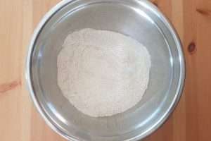 Peneire a farinha: Retire do multiprocessador e peneire a farinha numa tigela. Devolva os grãos que não passaram pela peneira para o multiprocessador até que se forme uma farinha fina.