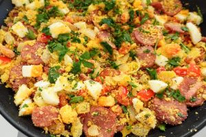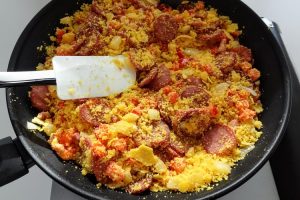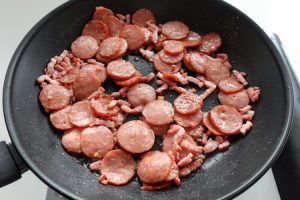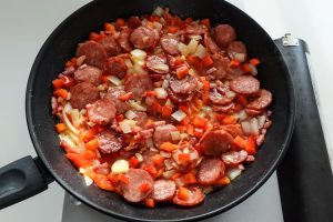 Fritar a linguiça: adicione a linguiça (ou chouriço) e frite até ficar um pouco dourada (cerca de 2 minutos). Não deixe ressecar.