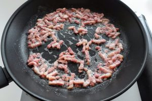 Fritar o bacon: coloque uma panela com fundo grosso em fogo médio e frite o bacon até começar a soltar gordura (cerca de 1 minuto)