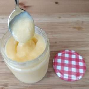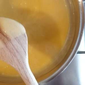 Cozinhe a mistura: Numa panela pequena, cozinhe a mistura em fogo baixo até que a aparência se torne lisa. Os coágulos desaparecem à medida que a manteiga da mistura derrete. Em seguida, aumente o fogo para médio e cozinhe, mexendo sempre, até que a misture espesse, cerca de 15 minutos. A temperatura neste ponto será em torno de 76°C. Não deixe ferver!