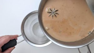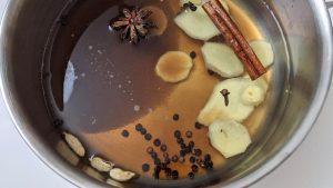 Prepare os ingredientes (mise en place): separe todos os ingredientes e meça-os, deixando-os devidamente prontos para o início da receita. Esta etapa é importante para o sucesso da sua receita, pois evita surpresas no meio do processo.Lave o gengibre. Prepare o gengibre: com o auxílio de uma colher de chá ou café, raspe a pele do gengibre para retirá-la. Desta forma, a pele sai com facilidade e evita-se o desperdício da parte interior. Por fim, corte-o com o auxílio de um mandolin ou faca bem afiada, em fatias muito finas, cerca de 2 mm.É possível substituir 20 g de gengibre fresco por 5 g de gengibre em pó. Prepare as especiarias (decocção): coloque a água filtrada, as fatias de gengibre, a canela em pau, o anis estrelado, os grãos de pimenta-preta/pimenta-do-reino, o cardamomo, os cravinhos e o açúcar mascavo/moreno em uma panela pequena. .Caso deseje um sabor mais pronunciado, macere as especiarias com o auxílio de um pilão e almofariz. Ferver: Leve a mistura para ferver em fogo médio. Quando ferver, reduza bem o fogo e mantenha uma fervura suave ("simmering") por 10 minutos.