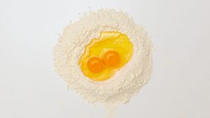 Adicionar ovos: adicione os ovos na centro da farinha de trigo.