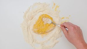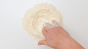 Fazer cavidade na farinha: despeja a farinha de trigo na superfície de trabalho e abra uma cavidade no centro para despejar os ovos.