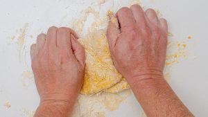 Abrir massa: abra a massa até que esteja bem fina, com cerca de 1mm de espessura. Passe o rolo do centro para cima, gire-a 45 graus (1/4 de uma volta) e volte a passar o rolo. Dessa forma a massa não grudará na mesa.A massa para macarrão, por ter pouca umidade, é um pouco dura e difícil de abrir. Polvilhar farinha: polvilhe farinha na massa caso comece a grudar na superfície de trabalho.