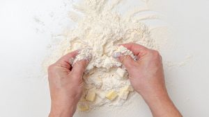 Misturar com dedos: com a ponta dos dedos, esfregue a manteiga à farinha/sal/açúcar. O objetivo é fazer com que todos os grãos de farinha estejam recobertos por uma camada de manteiga.