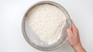 Peneirar a farinha: peneire a farinha sobre a superfície de trabalho (uma mesa, bancada ou uma tigela) .