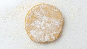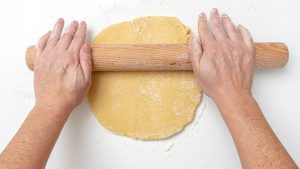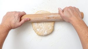 Polvilhar farinha: polvilhe uma boa quantidade de farinha sobre a superfície de trabalho. Polvilhe também no rolo de massa.