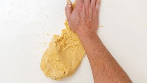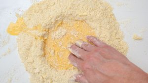 Misturar: com movimentos circulares, com as pontas dos dedos, misture a farinha à gema/água. Amasse a mistura com mãos para incorporar toda a farinha à massa. Não sove, pois não queremos a formação de glúten na massa.