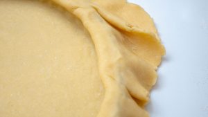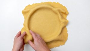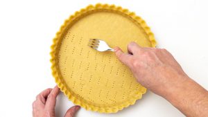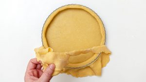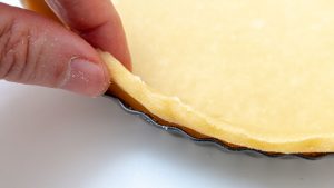 Ajustar na forma: com cuidado, ajuste a massa no fundo da forma. Molde-a ao formato da forma sem esticá-la. Se a massa for esticada, ela irá encolher muito ao ir ao forno.