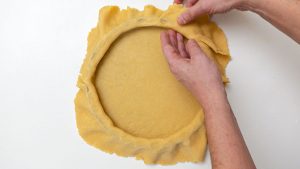Reutilizar sobras: as sobras podem ser reutilizadas para o preparo de outra torta ou para preparar biscoitos, tais como os biscoitos de natal. Desdobrar a borda: desdobre a borda da massa, para que ela fique acima da altura da forma.