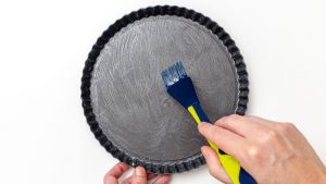 Guardar em filme plástico: embrulhe a massa em filme plástico. Antes de utilizá-la, refrigere por pelo menos 30 minutos ou por até 2 a 3 dias.Antes de embrulhar e refrigerar a massa, certifique-se de deixá-la em um formato circular. Isso facilitará abrí-la com o rolo, mantendo um formato redondo. Untar forma: Unte a forma com manteiga. Aqui utilizamos uma forma de aço carbono, com 24 cm de diâmetro e fundo removível.