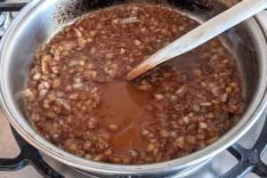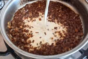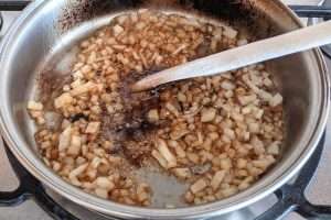 Cebola: frite a cebola até que esteja macia e levemente dourada; comece a soltar os pedacinhos de carne do fundo da frigideira, com o auxílio de uma espátula