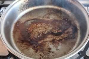 Grelhar: grelhe a carne de sua preferência (bovina, suína ou frango) em uma frigideira sem revestimento antiaderente; grelhe a carne em vários pontos da frigideira, para que a carne grude um pouco na frigideira, deixando o fundo da frigideira revestido com pedacinhos da carne que ali grudaram;
