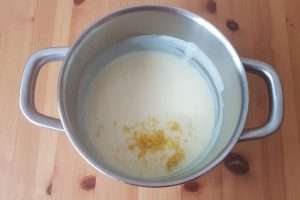 Adicione a gelatina no suco de limão: Em uma panela pequena, coloque o suco de limão, raspas de limão (opcional) e leite condensado. Em seguida, esprema as folhas de gelatina hidratas e adicione na mistura. Aqueça a mistura por alguns minutos, até que a gelatina dissolva. Reserve.A gelatina não pode ferver, pois quebrará a sua estrutura e arruinará suas propriedades de solidificação.