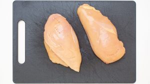 Frango: iremos utilizar dois peitos de frango de tamanho médio (entre 500 e 600 gramas no total).Pule as etapas de cortar e processar o peito de frango caso ele já tenha sido comprado moído.