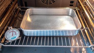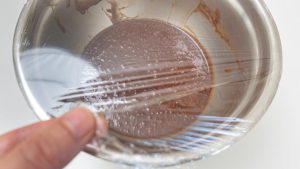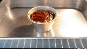 Refrigere a massa: cubra a massa com plástico filme/película aderente e leve-a para refrigeração por no mínimo 1 hora.A refrigeração retarda o cozimento do interior do bolinho. Preaqueça o forno: preaqueça o forno a 200ºC Celsius. É importante que o forno esteja bem quente antes de colocar a massa no forno, assim o petit gâteau cozinhará por fora e continuará cremoso por dentro. Preaqueça assadeira: coloque uma assadeira no forno para que também fique preaquecida.Aquecer uma assadeira ajudará a transmitir calor para o fundo e para as bordas do petit gâteau, fazendo com que a superfície asse bem e evitando assim que ele desmorone Coloque nas forminhas: distribua a massa nas duas forminhas untadas, cerca de 150 gramas por forminha.