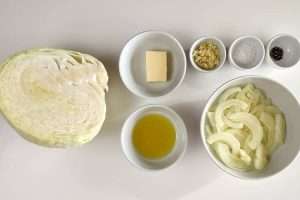Receita preparada com repolho verde/couve-branca, cebola, alho, manteiga sem sal, azeite de oliva, vinagre de maçã/vinagre de sidra, sal e pimenta-preta/pimenta-do-reino.