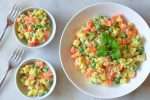 Misture os vegetais cozidos, cebola e o atum (opcional): Coloque os vegetais cozidos na tigela grande, juntamente com a cebola picada e misture bem. Em seguida, desfie o atum (opcional) em conserva drenado e coloque-o com os vegetais, misture bem. Espere uns 10 minutos para que os vegetais esfriem um pouco.